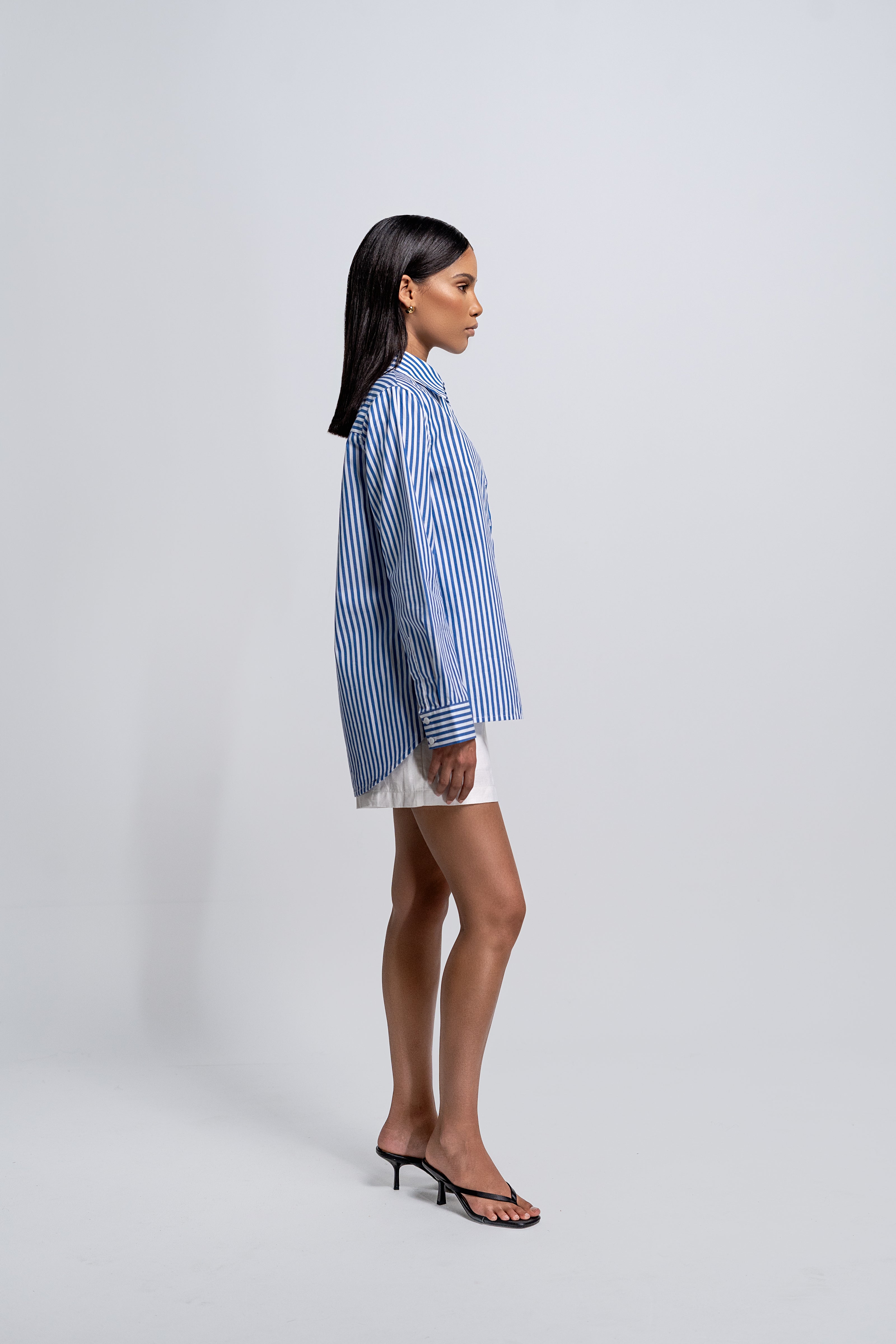 A modern approach to the traditional blue and white sailors stripe, reimagined in pure cotton and linen fabrication.