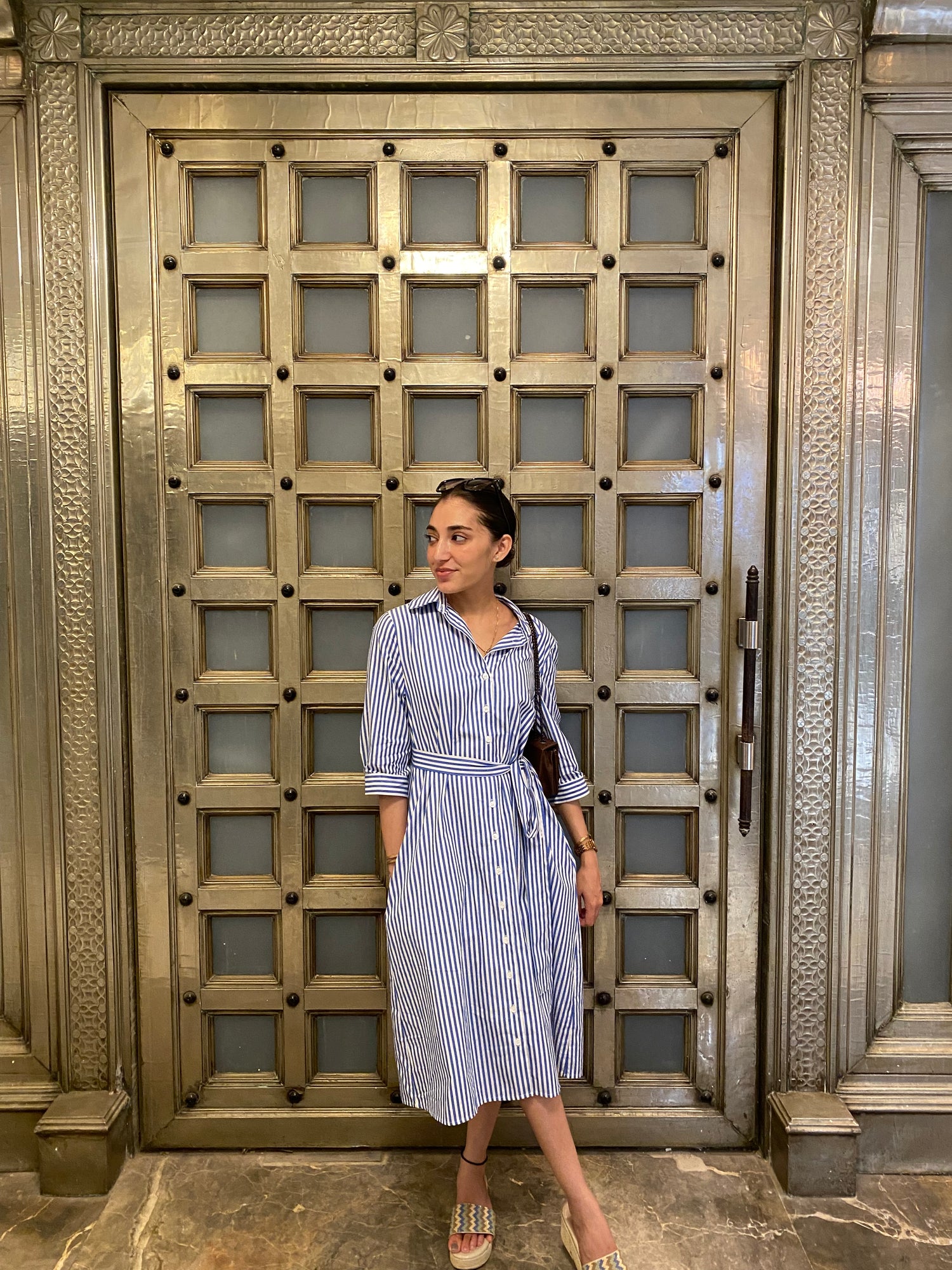 Manita is 5'2"/ 1.58m and a size 4. Here, she's wearing the Petite Riviera Stripe Shirt Dress in size 6 for a relaxed, oversized look and feel.