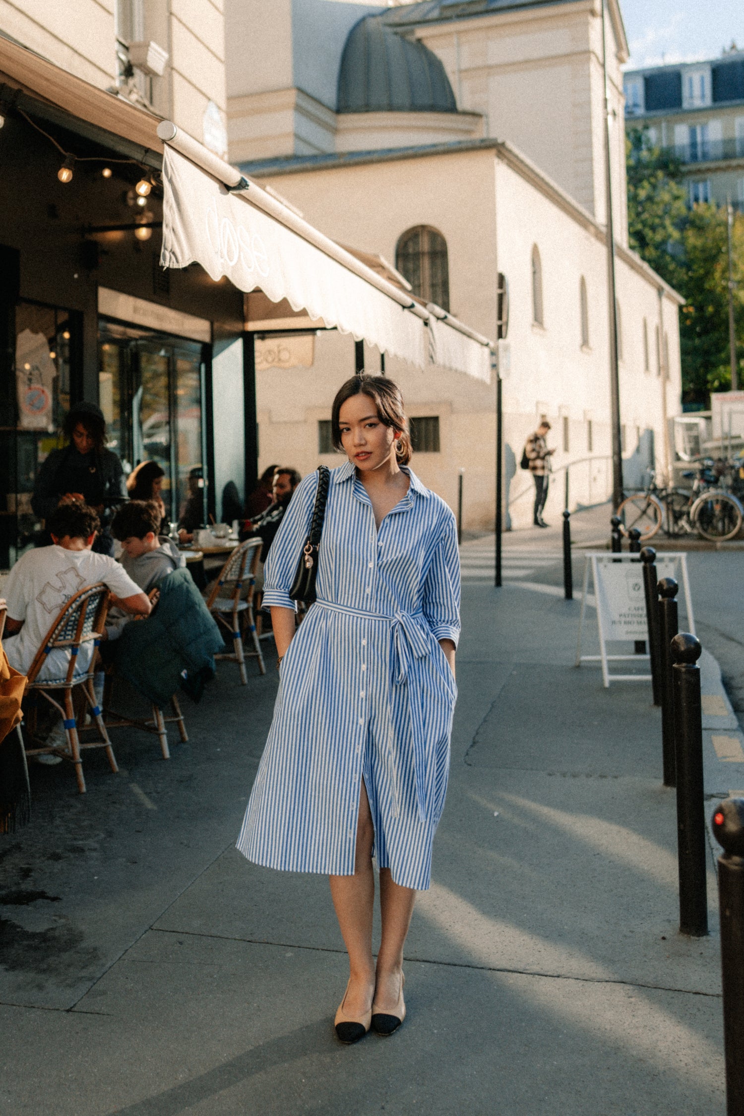 Bella is 1.55m/ 5'1" and wears the Petite Riviera Stripe Shirt Dress in her true size, size 6, during Paris Fashion Week.