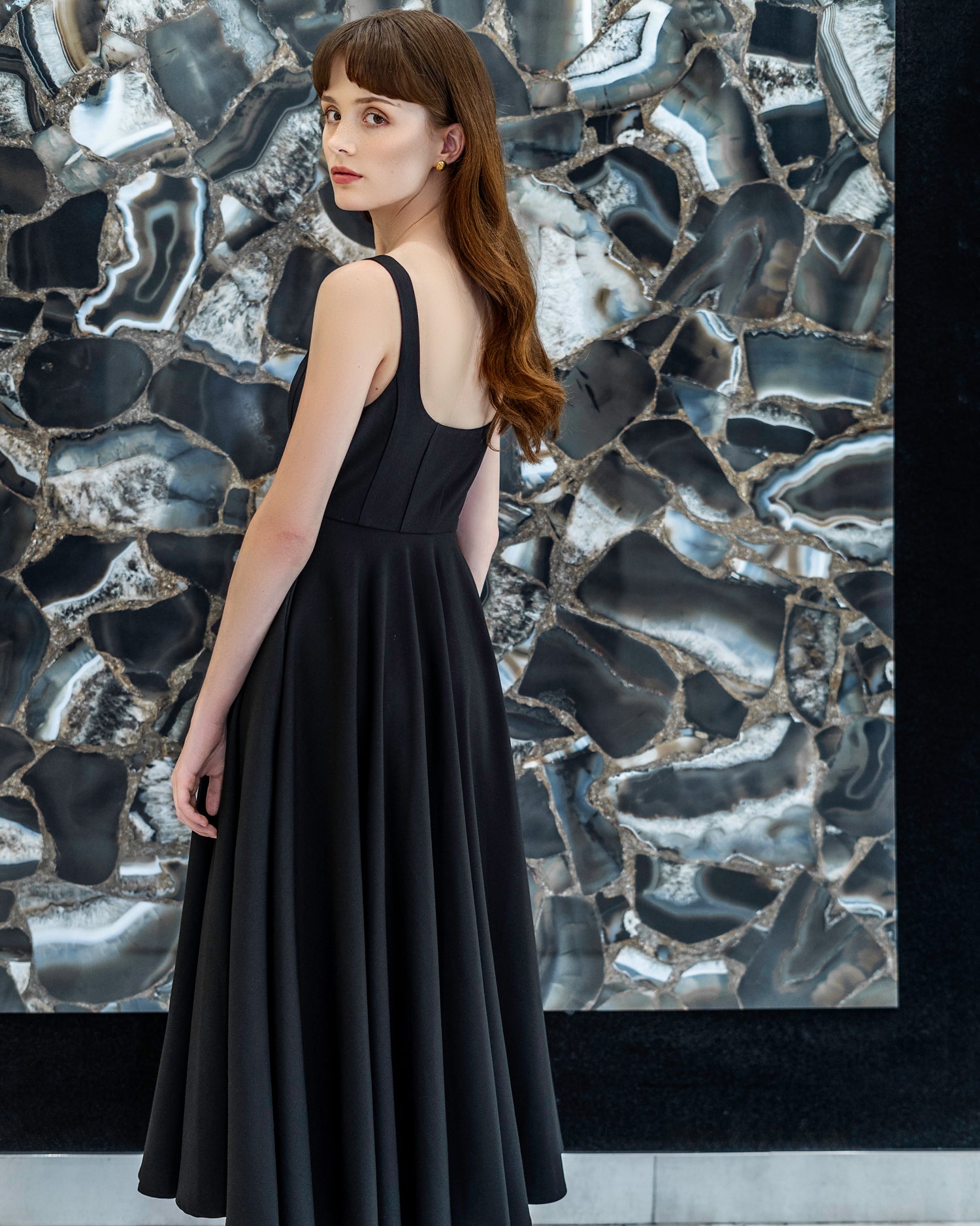 Laury is 1.56m/ 5f 1" and a size 4. Here, she wears the Petite Black Linen Mini Dress in her true size.